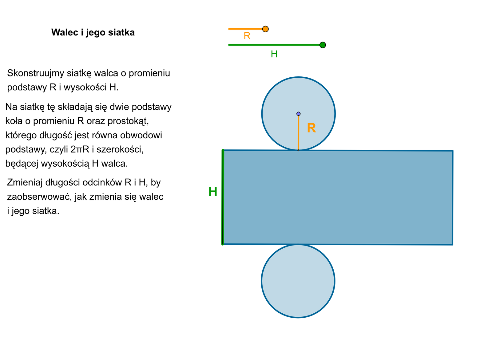 Obserwuj, jak wraz ze zmianą wysokości i promienia podstawy walca, zmieniają się wymiary figur tworzących siatkę walca. Co zauważasz?