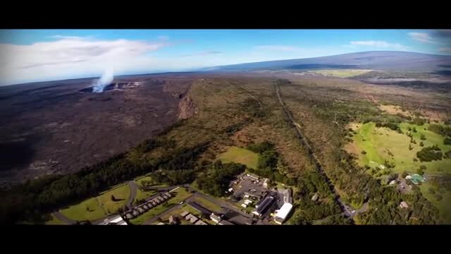 Film przedstawia krater wulkanu. Wokół krateru płaski teren bez roślinności. Z wnętrza krateru wydobywa się jasnoszary dym.