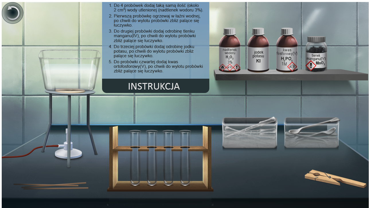 Odczynniki chemiczne: nadtlenek wodoru 3%; tlenek manganu(IV); jodek potasu; kwas ortofosforowy(V).