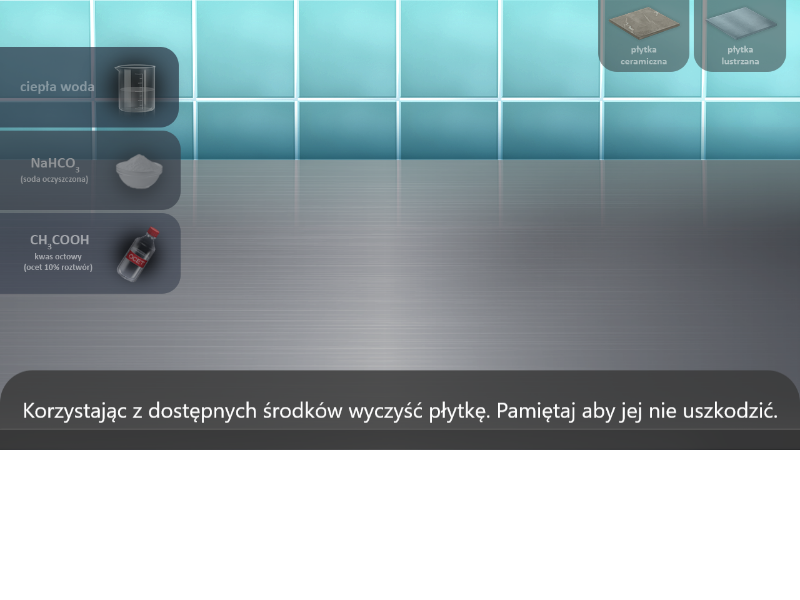 W wirtualnym laboratorium zaprezentowano czyszczenie płytki ceramicznej oraz lustrzanej za pomocą dwóch roztworów, pierwszy roztwór kwasu octowego w ciepłej wodzie, drugi roztwór wodorowęglanu sodu w wodzie. Oba roztwory umożliwiły oczyszczenie płytek, zarówno ceramicznej, jak i lustrzanej.