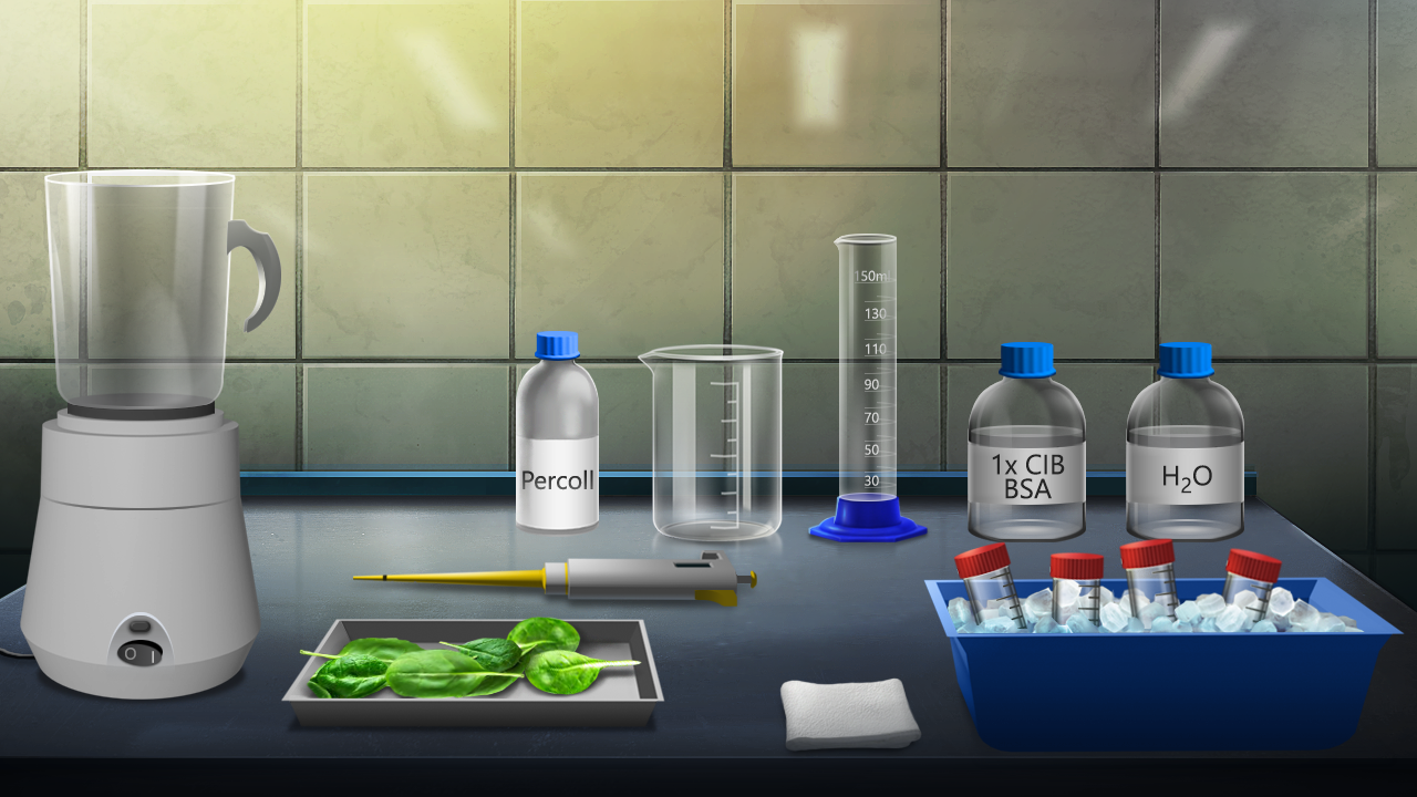 Ilustracja przedstawia stół, na którym znajdują się począwszy od lewej strony: blender, na którym ustawiony jest szklany kielich w kształcie prostokąta, z rączką po prawej stronie, automatyczna pipeta z ostrym zakończeniem, prostokątna tacka z owalnymi, zielonymi liśćmi szpinaku, półowalna butelka z napisem Percoll, walcowa zlewka z dzióbkiem po lewej stronie, probówka mająca stabilny stojak, filtr bibułowy zwinięty na kształt kwadratu, kuweta z lodem i probówkami oraz dwie szerokie butelki z napisami 1x CIB BSA oraz H dolny indeks 2 O.
