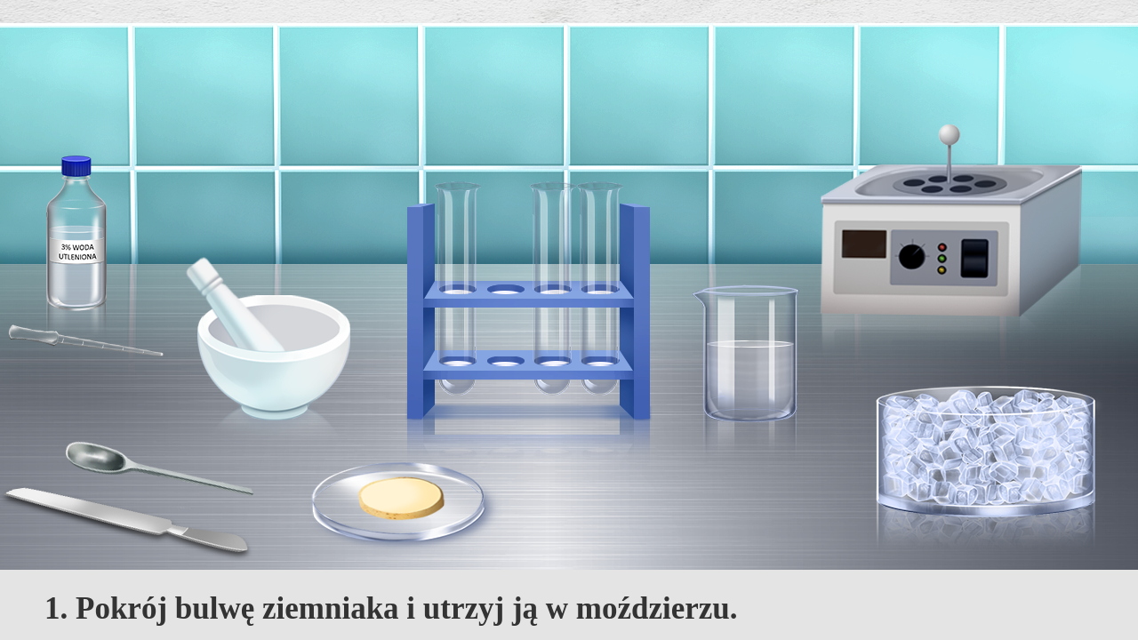 Na planszy do przeprowadzania doświadczeń widoczny jest szary blat z naczyniami laboratoryjnymi oraz plastrem bulwy ziemniaka. Na jasnej powierzchni znajduje się miska z moździerzem, skalpel, łyżeczka, pisak do podpisywania próbek, woda utleniona w butelce, stojak z trzema wąskimi, długimi probówkami, zlewka z wodą destylowaną, zlewka z pięcioma pipetami, szalka Petriego z płaskim plastrem wyciętym z ziemniaka oraz przyrząd laboratoryjny – łaźnia wodna z wyświetlaczem, który wyświetla temperaturę 100 stopni Celsjusza. Po kliknięciu na skalpel plaster ziemniaka znajdujący się w szalce Petriego zostaje pokrojony na mniejsze cząstki. Kawałki ziemniaka zostają przesypane do miski i zmiażdżone moździerzem na miazgę. Kolejno za pomocą łyżeczki pulpa ziemniaczana zostaje przełożona do zlewki z wodą destylowaną, a roztwór ten przelany do trzech próbówek podpisanych jako: próba kontrolna, próba podgrzewana, próba schłodzona. Próbówka z napisem próba podgrzewana zostaje umieszczona w kąpieli wodnej w temperaturze 100 stopni Celsjusza, próbówka z napisem próba schłodzona zostaje umieszczona w pojemniku z lodem – obie na czas 10 sekund. Do wszystkich tych próbówek zostaje dodana niewielka ilość 3% wody utlenionej. Poziom płynu w probówce, która była przechowywana w temperaturze pokojowej wzrasta, płyn pieni się. Poziom płynu w probówce przechowywanej w lodzie nieznacznie wzrasta i powstaje niewielka ilość piany, a poziom płynu w probówce, która znajdowała się w wysokiej temperaturze nie zmienia się.