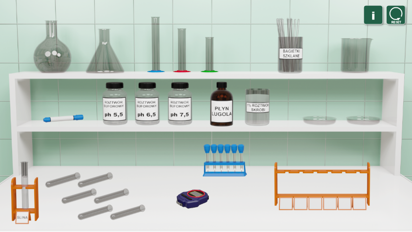 Zdjęcie przedstawia białą półkę w laboratorium biologicznym. Na dwupoziomowej półce znajduje się sprzęt laboratoryjny niezbędny do przeprowadzenia doświadczenia. Są na niej talerze, szklana butelka z wodą, sześć probówek, łyżeczka, pipeta, miarka, płyn Lugola, kleik skrobiowy i trzy bufory o różnym odczynniku pH.