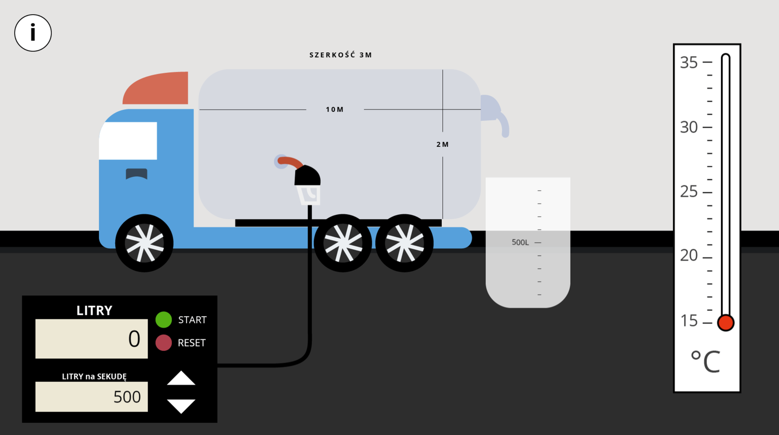 Na ekranie widoczny jest samochód cysterna o niebieskiej kabinie skierowanej w lewo, czerwonym daszku i szarym pojemniku na paliwo umieszczonym na przyczepie. Podane są wymiary pojemnika: dziesięć metrów długości, trzy metry szerokości i dwa metry wysokości. Do cysterny podłączony jest czarny wąż zakończony wlewem. Dugi koniec węża jest podłączony do dystrybutora paliwa. Jest on wyposażony w licznik odmierzający, z rozdzielczością jednego litra, ilość wlanego paliwa oraz w dwa przyciski: zielony włącza i wyłącza napełnianie cysterny, czerwony zeruje licznik wlanego paliwa. Dystrybutor zawiera także przełącznik tempa tankowania. Użytkownik może nastawić wartości dziesięć, sto, pięćset, tysiąc lub pięć tysięcy litrów na sekundę. Na tylnej ścianie zbiornika cysterny, z prawej strony ekranu, widoczny jest otwór z lejkiem, przez który wypływa nadmiar paliwa ze zbiornika. Otwór ten jest ustawiony około sto pięćdziesiąt centymetrów nad podłogą zbiornika – nie jest więc możliwe całkowite napełnienie zbiornika benzyną. Nadmiar paliwa trafia do beczki o pojemności tysiąca litrów, na którym widoczna jest podziałka co sto litrów. Po rozpoczęciu tankowania cysterny w zbiorniku pojawia się żółty płyn, a po przekroczeniu maksymalnej objętości zaczyna on wylewać się do beczki. Kliknięcie w cysternę lub w beczkę pozwala opróżnić kliknięty zbiornik z benzyny. Na prawo od beczki widoczny jest pionowy prostokąt z typową skalą temperatury, w zakresie od piętnastu do trzydziestu pięciu stopni Celsjusza, z podziałką co jeden stopień. Co piąta kreska podziałki jest opisana. Przesunięcie pionowego czerwonego suwaka w tym prostokącie podnosi temperaturę benzyny w zbiorniku, co może skutkować przelaniem się benzyny do beczki. Zmienia się także temperatura benzyny w beczce, co powoduje ledwie zauważalne zmiany poziomu paliwa. W lewym górnym rogu ekranu znajduje się przycisk, za pomocą którego można wyświetlić instrukcję obsługi Wirtualnego laboratorium.