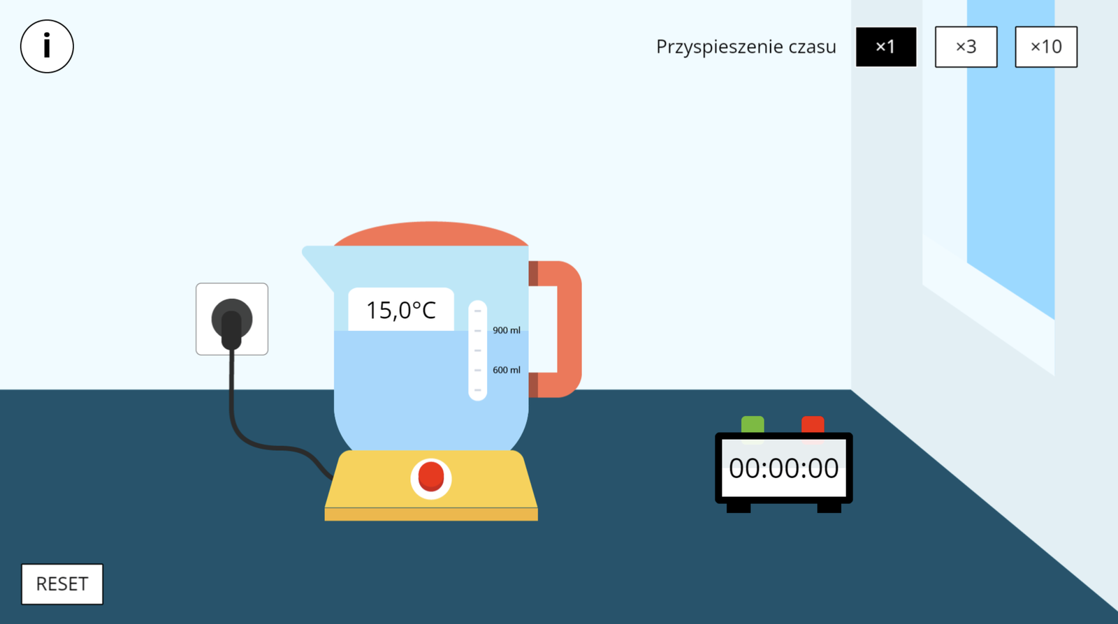 Na ekranie w wirtualnym laboratorium widoczne jest pomieszczenie , w którym na płaskim i poziomym blacie stołu widoczny jest czajnik. Czajnik składa się z pomarańczowej podstawy, niebieskiego zbiornika, w którym znajduje się woda i czerwonego ucha i pokrywki. Czajnik podłączony jest do gniazdka z prądem czarnym przewodem. Na podstawie czajnika znajduje się czerwony przycisk służący do jego włączenia. W czajniku znajduje się dziewięćset mililitrów wody. Początkowa temperatura wody w czajniku to piętnaście stopni Celsjusza. Obok czajnika, po prawej stronie widoczny jest prostokątny stoper o białym wyświetlaczu i czarnej obudowie. Na stoperze znajdują się dwa przyciski, zielony służący do wystartowania i zakończenia pomiaru czasu i czerwony służący do zresetowania wyniku. Po włączeniu czajnika startuje również pomiar czasu. Woda zaczyna się podgrzewać od wartości temperatury początkowej równej piętnaście stopni Celsjusza do stu stopni Celsjusza, a dalsze podgrzewanie powoduje parowanie wody. Użytkownik może skorzystać z pomiaru czasu rzeczywistego lub przyspieszonego trzykrotnie lub dziesięciokrotnie, przy pomocy trzech prostokątnych przycisków widocznych w prawym i górnym rogu ekranu. Czas potrzebny do zagotowania wody to około trzech minut. Czas potrzebny na całkowite odparowanie wody z czajnika od momentu jego włączenia i rozpoczęcia podgrzewania wody to dwadzieścia minut. Czas po którym w czajniku pozostanie sześćset mililitrów wody to osiem minut i dziesięć sekund.
