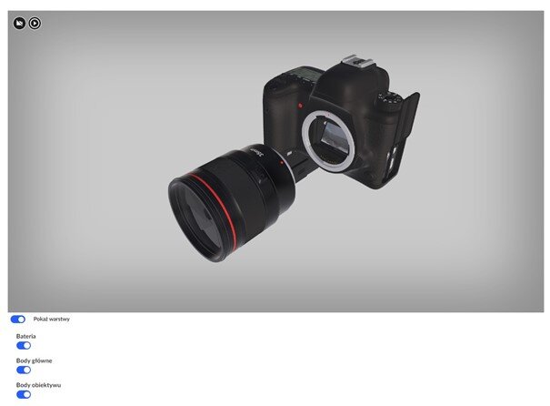W lewym dolnym rogu, pod ekranem, znajduje się suwak „Pokaż warstwy”. Po przesunięciu suwaka w prawo, wyświetla się lista warstw (w postaci suwaków), które można włączać i wyłączać (przesuwając suwak w prawo lub w lewo), w celu zobaczenia wybranego elementu modelu aparatu (np. baterii, obudowy, wewnętrznego szkła obiektywu itd.).