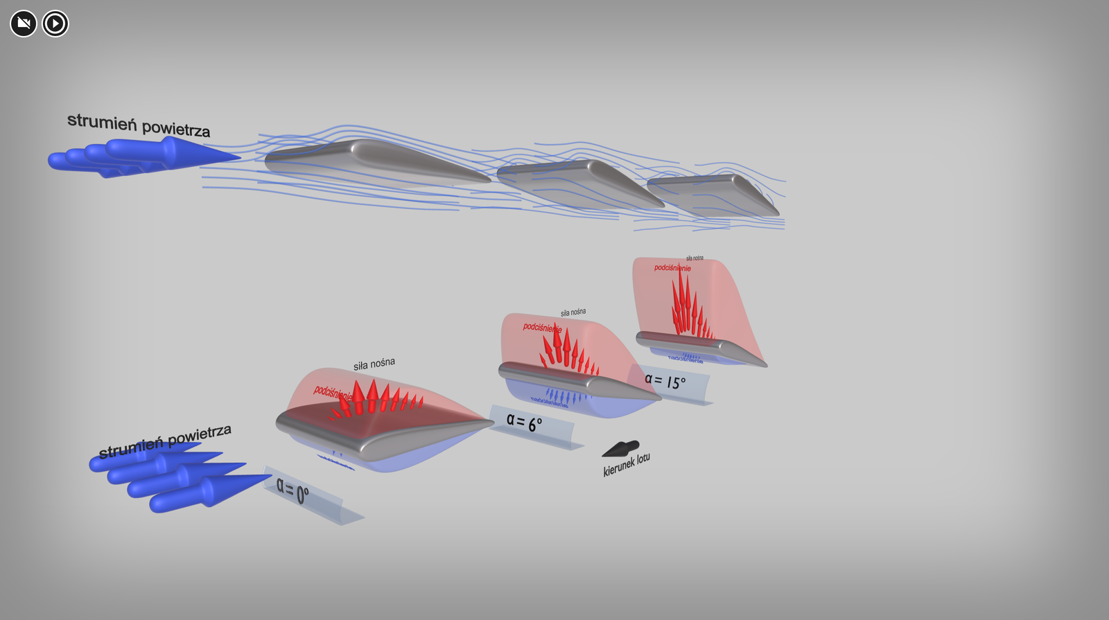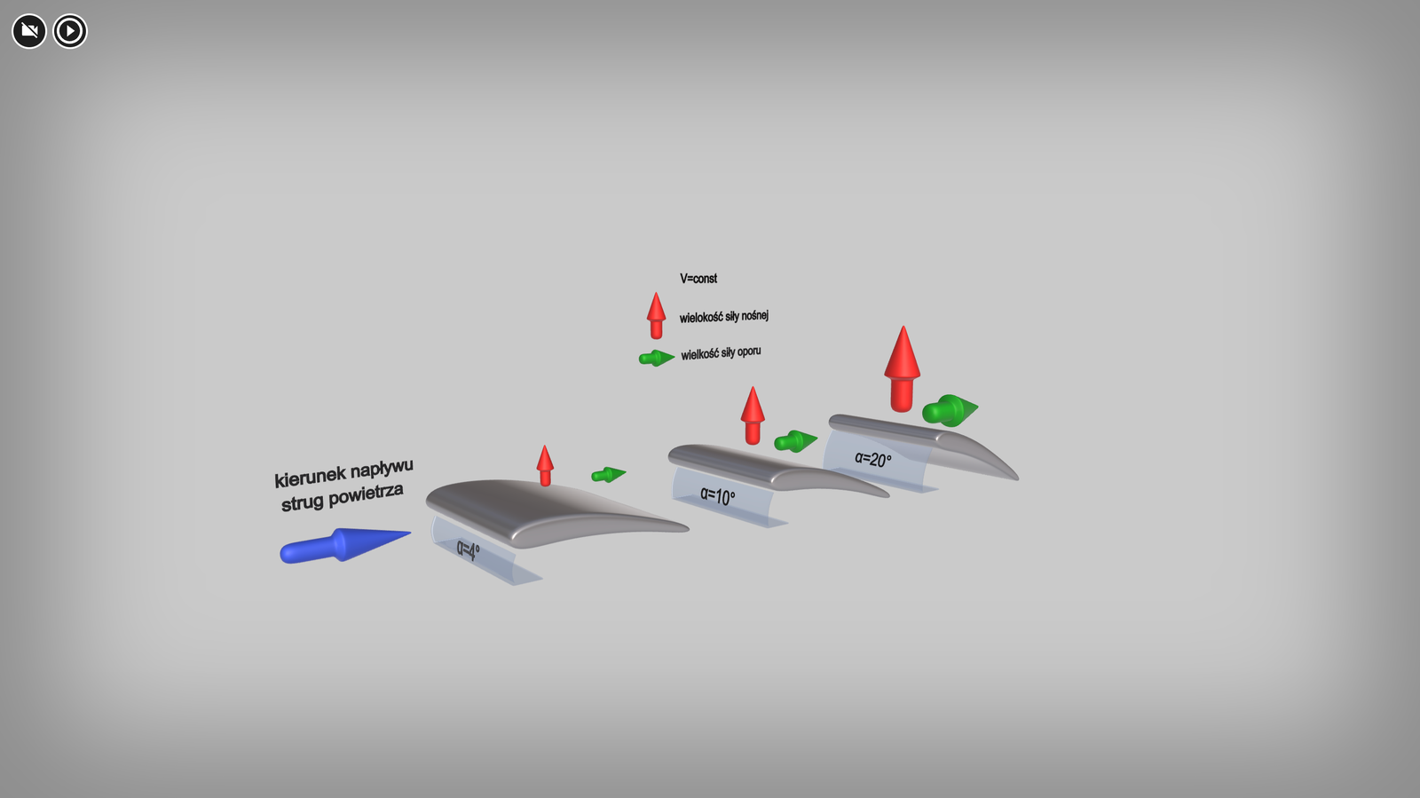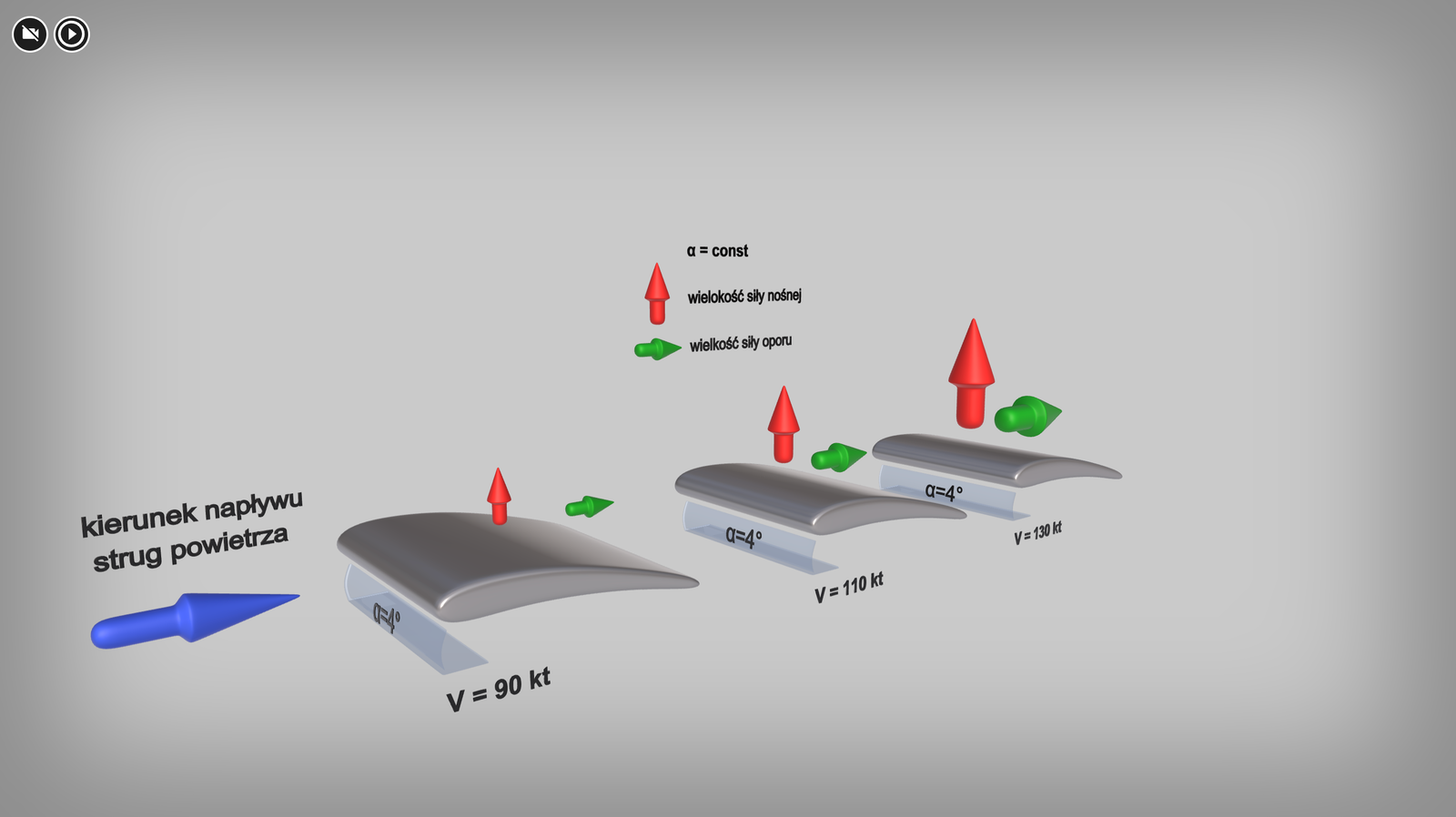 Wizualizacja 3 D przedstawia powstawanie sił aerodynamicznych. Pokazano poprzecznie wycięty kawałek skrzydła. Widoczny jest jego przekrój poprzeczny w kształcie wydłużonego migdału, gdzie szersza i zaokrąglona część to przód, a wąski ostry koniec to tył skrzydła. Zaznaczono kierunek napływu strug powietrza. Kierunek reprezentuje pozioma strzałka skierowana grotem w przednią część skrzydła. Zakładamy, że prędkość samolotu jest stała, co zapisano jako V równa się constans. Rozważono trzy przypadki opisane trzema wielkościami: kątem nachylenia skrzydła do poziomu alfa, siłą nośną i siłą oporu. Zaznaczmy, że tył skrzydła jest wierzchołkiem kąta. Wektory obu sił przyłożono w środku kawałka skrzydła. Wektor siły nośnej jest pionowy i ma zwrot w górę, natomiast wektor siły oporu jest poziomy i ma zwrot zgodny z kierunkiem działania wiatru, czyli jest skierowany w stronę tyłu samolotu.
