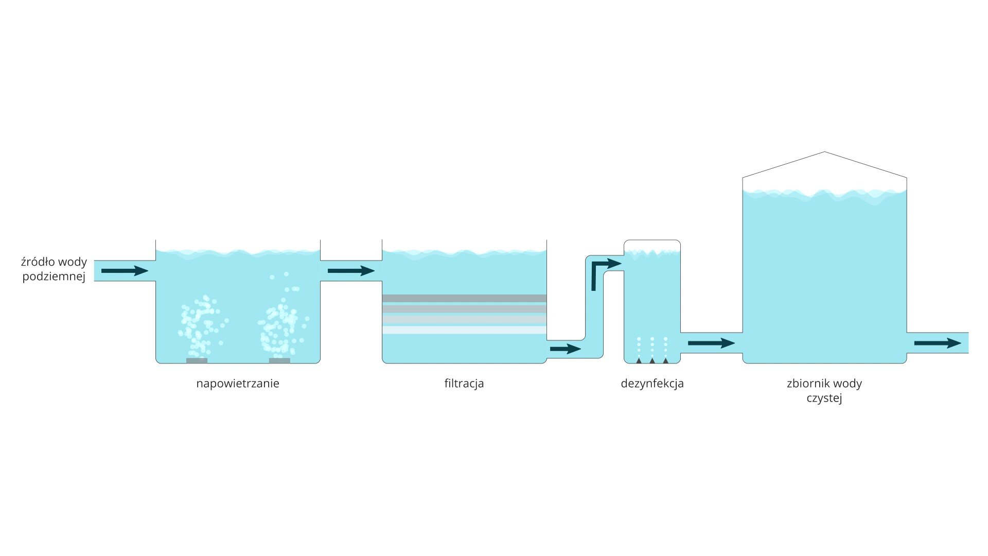 Elementy do uszeregowania: 1. dezynfekcja, 2. napowietrzanie, 3. zbiornik wody czystej, 4. wytrącanie drobnych zawiesin i ich oddzielenie, 5. ujęcie wody