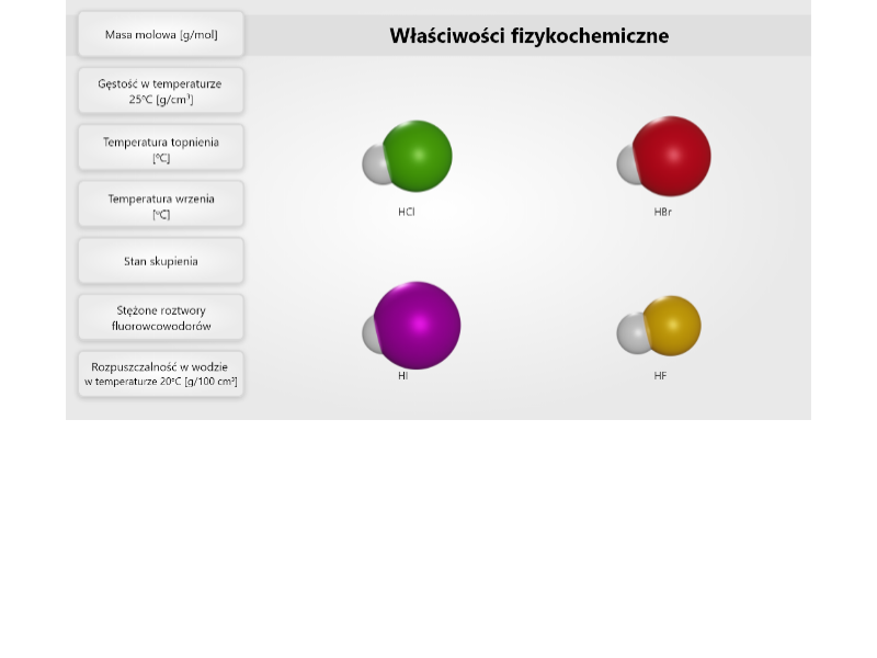 W symulacji przedstawiono wybrane właściwości fizykochemiczne halogenowodorów. Cząsteczkę fluorowodoru przedstawiono jako dużą, żółtą kulę reprezentującą atom fluoru, który to połączony jest z małą białą kulką symbolizującą atom wodoru. Cząsteczkę chlorowodoru przedstawiono jako dużą, zieloną kulę reprezentującą atom chloru, który to połączony jest z małą białą kulką symbolizującą atom wodoru. Cząsteczkę bromowodoru przedstawiono jako dużą, czerwoną kulę reprezentującą atom bromu, który to połączony jest z małą białą kulką symbolizującą atom wodoru. Cząsteczkę jodowodoru przedstawiono jako dużą, fioletową kulę reprezentującą atom jodu, który to połączony jest z małą białą kulką symbolizującą atom wodoru. Uwzględniono różnicę wielkości atomów halogenowych tak, że żółta kulka jest mniejsza od zielonej, zielona od czerwonej, a czerwona od fioletowej największej kulki. Cząsteczki w symulacji rotują względem środka ciężkości cząsteczki. Podano masy molowe M w gramach na mol. Dla fluorowodoru wynosi ona 20,01; dla chlorowodoru jest równa 36,46; dla bromowodoru wynosi 80,91; zaś dla jodowodoru 127,911. Dalej podano gęstości wyrażone w gramach na centymetr sześcienny, które wynoszą odpowiedni dla fluorowodoru 0,96; dla chlorowodoru 1,19; dla bromowodoru 2,17 oraz dla jodowodoru 2,80. Następnie podano wartości temperatur topnienia od najniższej do najwyższej wyrażone w stopniach Celsjusza, które wynoszą kolejno dla chlorowodoru minus 114, dla bromowodoru minus 87, dla fluorowodoru minus 84 oraz dla jodowodoru minus 51. Dalej przedstawiono wartości temperatur wrzenia od najniższej do najwyższej wyrażone w stopniach Celsjusza, które wynoszą kolejno dla chlorowodoru minus 85, dla bromowodoru minus 67, dla jodowodoru minus 35 oraz dla fluorowodoru 20. Stan skupienia fluorowodoru w temperaturze powyżej dwudziestu stopni Celsjusza jest gazowy, zaś poniżesz fluorowodór jest cieczą. Pozostałe analogi, to jest chlorowodór, bromowodór i jodowodór w temperaturze pokojowej są gazami. Dalej opisano stężone roztwory fluorowcowodorów. Kwas bromowodorowy zawiera około 47 procent bromowodoru, jest bezbarwną lub żółtawą (na skutek wydzielającego się bromu) cięższą od wody cieczą. Stężony kwas chlorowodorowy zawiera około 37 procent chlorowodoru i również jest bezbarwną cieczą cięższą od wody. Stężony kwas fluorowodorowy dostępny handlowo zawiera około siedemdziesięciu procent fluorowodoru, jest bezbarwną cieczą, dymiącą na powietrzu o ostrym zapachu. Kwas jodowodorowy dostępny handlowo jest jako roztwór dziesięcio- lub pięćdziesięciosiedmioprocentowy. Jest on nietrwały, należy go przechowywać w ciemnym miejscu. Czysty kwas jodowodorowy jest bezbarwny, jednak w praktyce może mieć zabarwienie brązowe od powstającego jodu.