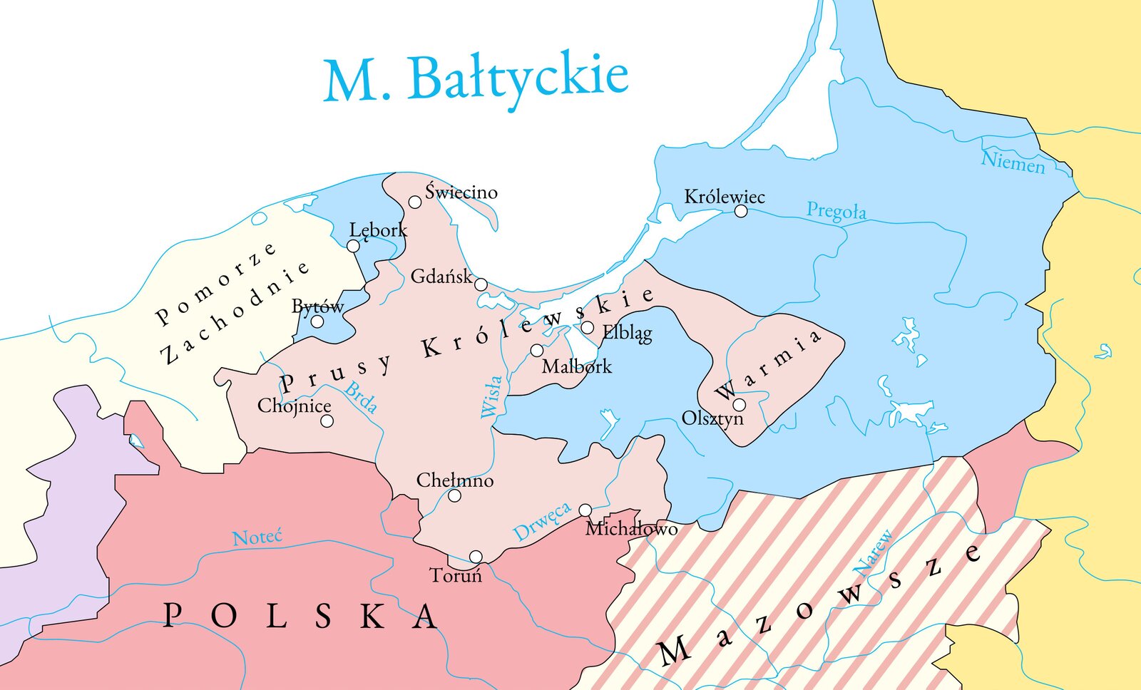 Mapa interaktywna pt. Postanowienia drugiego pokoju toruńskiego w 1466 r. Na mapie zaznaczone zostały terytoria położone nad Morzem Bałtyckim u ujścia Wisły i Niemna. Na tych terenach znajdowało się państwo zakonu krzyżackiego. Mapa przedstawia jego obszar w granicach po pierwszym pokoju toruńskim w 1411 r. Państwo to obejmowało Pomorze Gdańskie, ziemię lęborsko‑bytowską, chełmińską, Warmię oraz ziemie położone na pograniczach z Mazowszem i Litwą. Na mapie zaznaczono najważniejsze miasta: Gdańsk, Toruń, Malbork, Królewiec, Chojnice, Chełmno i Michałowo. Na mapie naniesione zostały zmiany, które dokonały się na tych obszarach w wyniku drugiego pokoju toruńskiego w 1466 r. Utworzona została odrębna prowincja Królestwa Polskiego jako Prusy Królewskie. Obejmowała ona Pomorze Gdańskie, Warmię i ziemię chełmińską. Reszta danego państwa krzyżackiego pozostała pod władzą wielkiego mistrza jako tzw. Prusy zakonne. Mapa składa się z warstwy bazowej i 2 warstw dodatkowych. Opis warstwy bazowej: Postanowienia drugiego pokoju toruńskiego w 1466 r. Warstwy dodatkowe: ● Warstwa 1 - Prusy zakonne (krzyżackie). Po zawarciu drugiego pokoju toruńskiego państwo krzyżackie obejmowało jedynie część dawnego terytorium. Był to obszar pozostający w zależności od Królestwa Polskiego, gdyż wielcy mistrzowie musieli skład hołd królowi polskiemu. Stolica państwa została przeniesiona z Malborka do Królewca. ● Warstwa 2 - Prusy Królewskie. Po zawarciu drugiego pokoju toruńskiego z terytorium państwa krzyżackiego wydzielono obszar, z którego powstała nowa prowincja Królestwa Polskiego, Prusy Królewskie. Obejmowały one Pomorze gdańskie, ziemię chełmińską, okolice Malborka i Elbląga oraz Warmię. Na warstwie 2 znajdują się 3 punkty z dodatkowymi informacjami: ► Punkt 1 - ziemia bytowska. Ziemia bytowska (wraz z lęborską) to okręgi historyczne na Pomorzu. Wchodziły one we wczesnym średniowieczu w skład ziem pod władaniem książąt pomorskich. Od schyłku XIII w. znalazły się pod panowaniem książąt wielkopolskich. W 1307 r. zagarnięte przez margrabiów brandenburskich, którzy w 1309 r. odsprzedali je zakonowi krzyżackiemu. Od 1466 r. powróciła pod władzę książąt pomorskich. Od 1526 r. były lennem Polski. Punkt z dodatkowymi informacjami zawiera również grafikę: Mapa przedstawia widok miasta Bytowa w XVII wieku. Miasto narysowane zostało w sposób uproszczony. Zaznaczone zostały główne drogi. Po lewej stronie widoczne są zabudowania miejskie oraz rynek wraz z ratuszem. Po prawej stronie widoczny jest zamek. ► Punkt 2 - ziemia chełmińska. Ziemia chełmińska to kraina historyczna, która w okresie wczesnopiastowskim znajdowała się na pograniczu ziem państwa polskiego i terytoriów zamieszkanych przez Prusów. Z czasem znalazła się pod władzą książąt mazowieckich. Głównym miastem tej ziemi było Chełmno. Stąd podejmowano wyprawy chrystianizacyjne na ziemie pruskie. Tutaj również osiedlili się rycerze zakonu krzyżackiego. W 1228 r. ziemia ta została im nadana w dzierżawę przez księcia Konrada Mazowieckiego. Na podstawie sfałszowanych dokumentów została ona bezprawnie zagarnięta przez zakon. Od 1466 r. wchodziła w skład Prus Królewskich. Punkt z dodatkowymi informacjami zawiera również grafikę: Ilustracja przedstawia herb miasta Chełmna. Przedstawia on tarczę herbową, nad którą znajduje się korona królewska. Wewnątrz tarczy znajduje się krzyż nad płynącymi wodami. ► Punkt 3 - Warmia. Warmia to kraina historyczna, która znajdowała się na terenie państwa krzyżackiego w Prusach. Stanowiła ona terytorium będące w posiadaniu biskupów warmińskich. Głównym miastem Warmii był Lidzbark Warmiński, w którym urzędowali biskupi. Ponieważ pod koniec wojny trzynastoletniej biskup warmiński opowiedział się po stronie Królestwa Polskiego, jego ziemie na mocy II pokoju toruńskiego znalazły się pod polskim panowaniem jako część Prus Królewskich. Punkt z dodatkowymi informacjami zawiera również grafikę: Ilustracja przedstawia herb miasta Lidzbarka Warmińskiego. Wewnątrz tarczy herbowej umieszczony jest baranek w aureoli podtrzymujący pastorał biskupi.