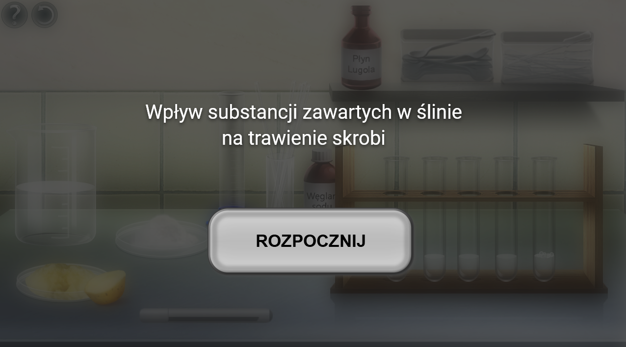 W probówkach 1 i 2 umieszczono 5 ml roztworu skrobi. Do probówki 1 dodano 0,5 ml wodnego roztworu śliny, który wcześniej zagotowano, a następnie ostudzono. Do probówki 2 dodano 0,5 ml wodnego roztworu śliny. Obie probówki trzymano przez 10 min w temperaturze 37°C, a następnie dodano do nich po 0,5 ml płynu Lugola.