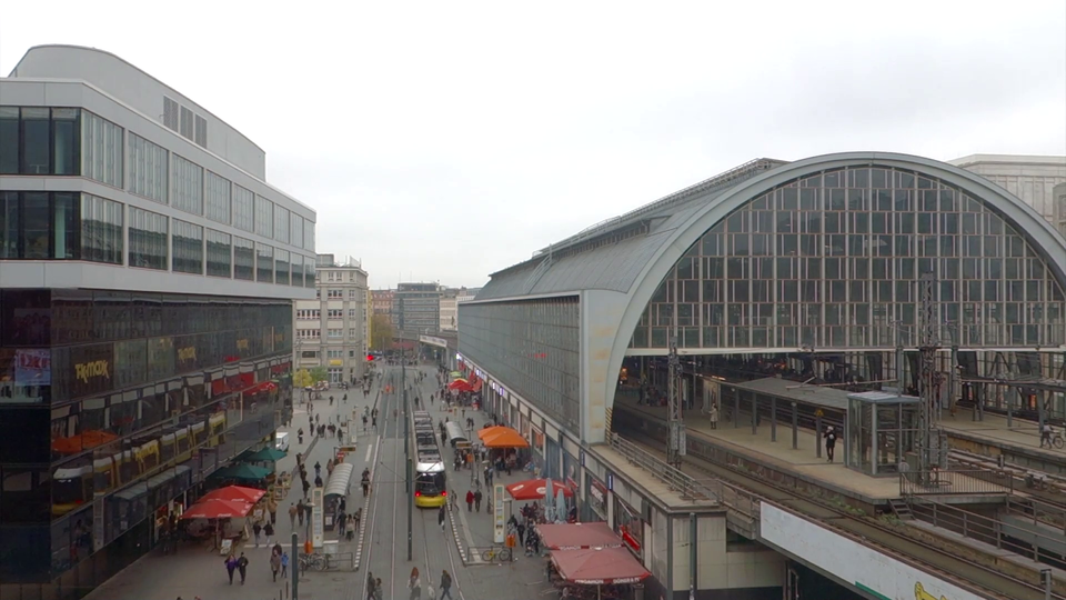 Zdjęcie przedstawia parking, na którym zaparkowane zostały autobusy. Parking znajduje się pomiędzy budynkami.