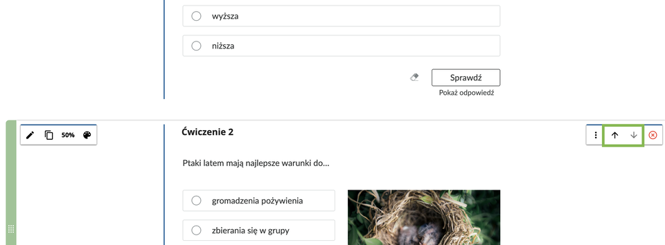 Kolejność komponentów można ustawić za pomocą strzałek widocznych po wskazaniu kursorem danego elementu (po prawej stronie) lub przeciągając (chwytając zielone pole po lewej stronie).