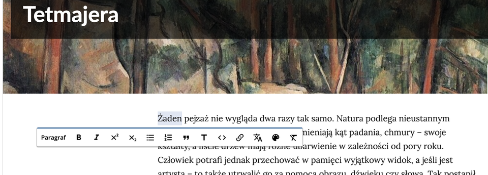 Zaznaczenie fragmentu tekstu wyświetla opcje edycji tj. pogrubienie, lista, nagłówki, zmiana koloru.