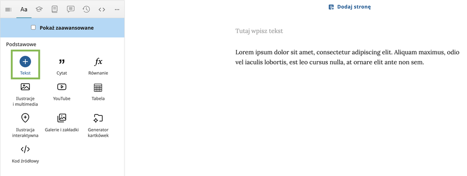 Tekst i komponenty osadzone wcześniej w materiale edytowane są w obszarze roboczym. Nowe komponenty wstawiane są poprzez kliknięcie ich ikony w przyborniku (kliknięcie ikony Tekst powoduje wstawienie przykładowego fragmentu tekstu na stronę, kliknięcie ikony Równanie powoduje wstawienie przykładowego równania matematycznego do dalszej edycji itd.).