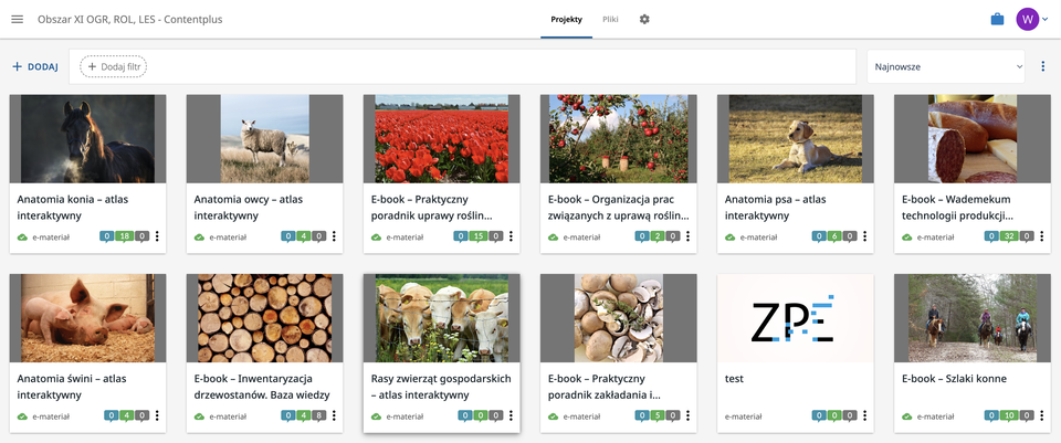 Pierwszym ekranem, który widzimy po przejściu do Edytora (http://edytor.zpe.gov.pl), jest lista projektów. Jeżeli do naszego konta są już przypisane jakieś e‑materiały, będą widoczne w tym miejscu pod postacią kafelków
