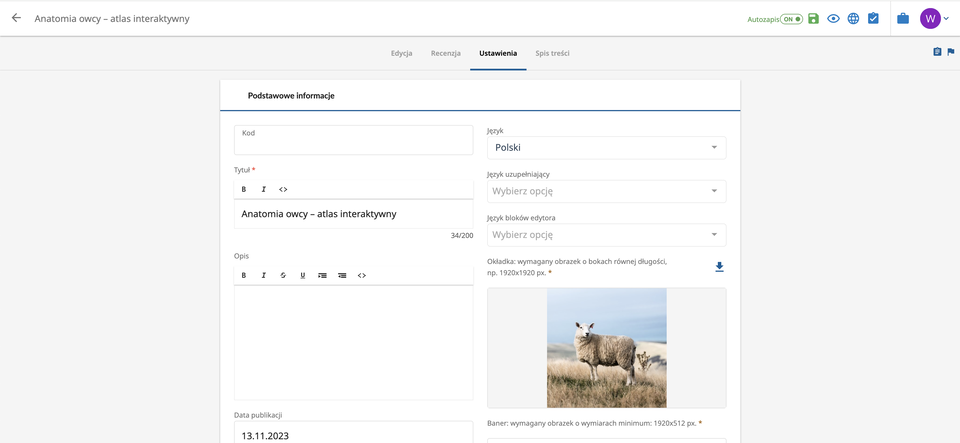Wymagania odnośnie metadanych, jakie beneficjent powinien uzupełnić w formularzu widocznym po wybraniu opcji Ustawienia, opisane są w dokumentacji konkursowej lub precyzowane na etapie realizacji projektu przez zespół recenzencki.