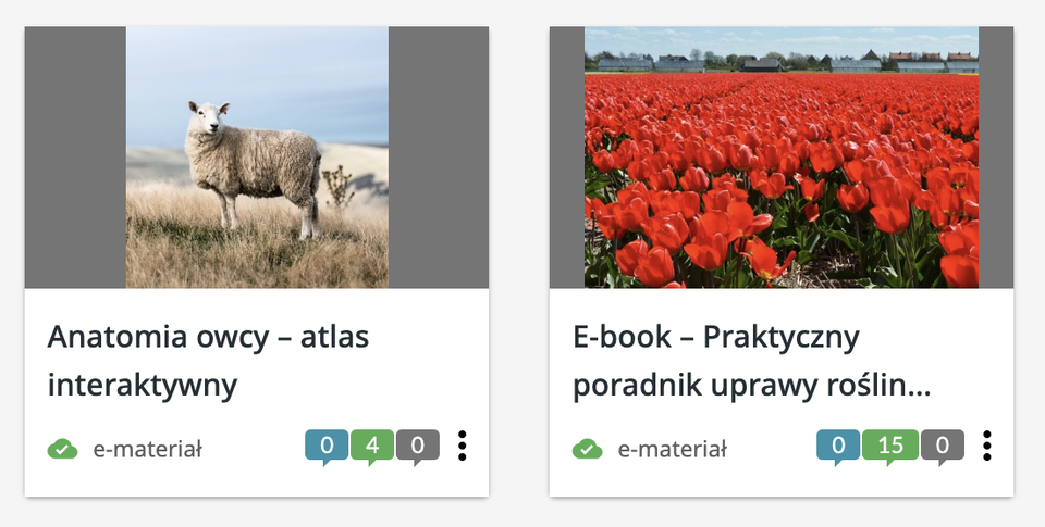 Poza tytułem e‑materiału widoczna jest również jego okładka oraz liczba zgłoszeń, które zostały wprowadzone przez osoby pracujące nad publikacją, np. ekspertów, autorów, redaktorów.