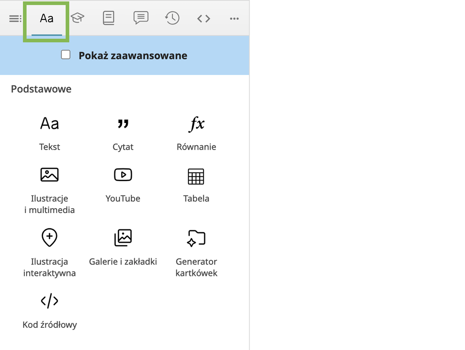 Ćwiczenia interaktywne można dodać do materiałów klikając jedną z ikon widocznych w trzeciej zakładce.