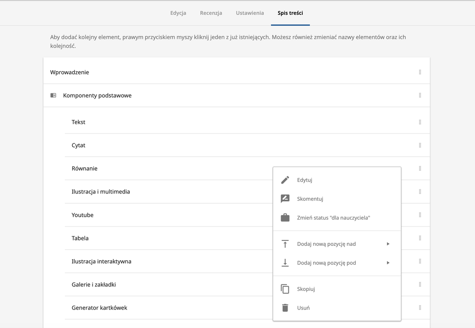 W tej zakładce możemy zarządzać strukturą naszego e‑materiału, czyli tworzyć dokumenty i nadawać im właściwą kolejność.