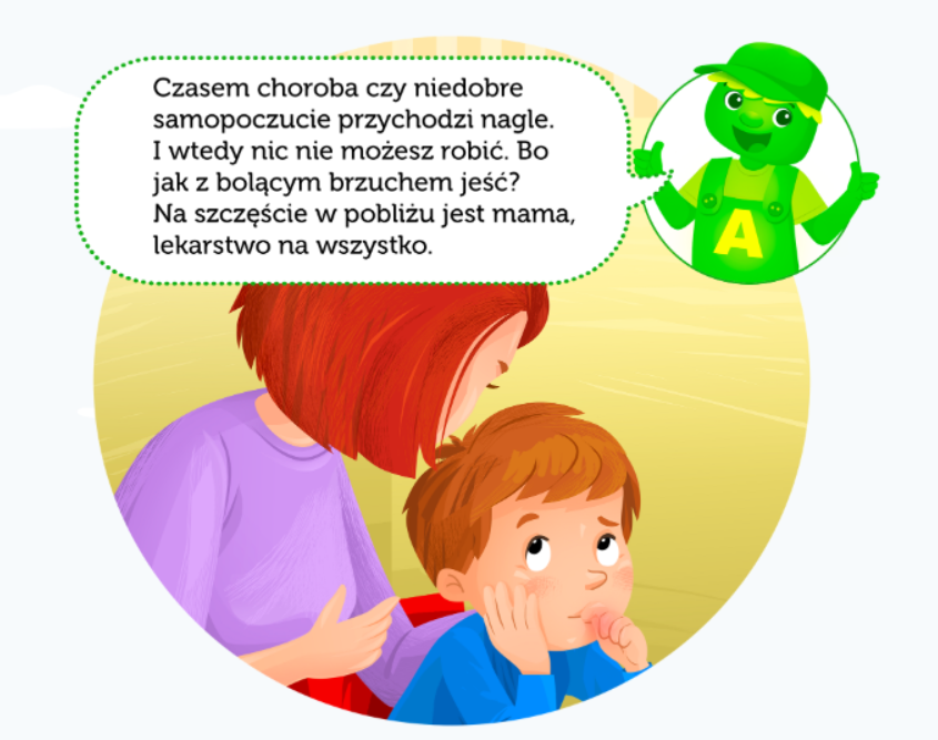 Ilustracja przedstawia dziewczynkę leżącą w łóżku. Obok siedzi kobieta z lekarstwem.