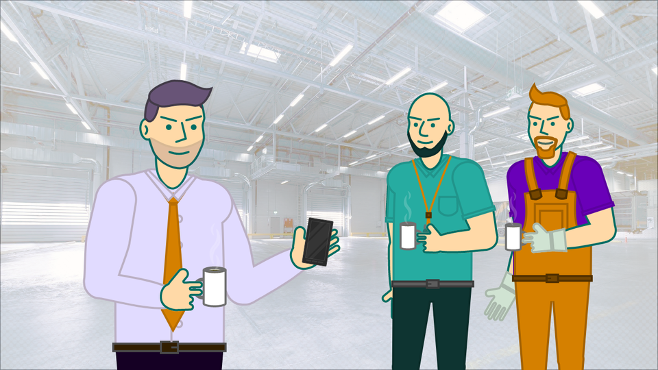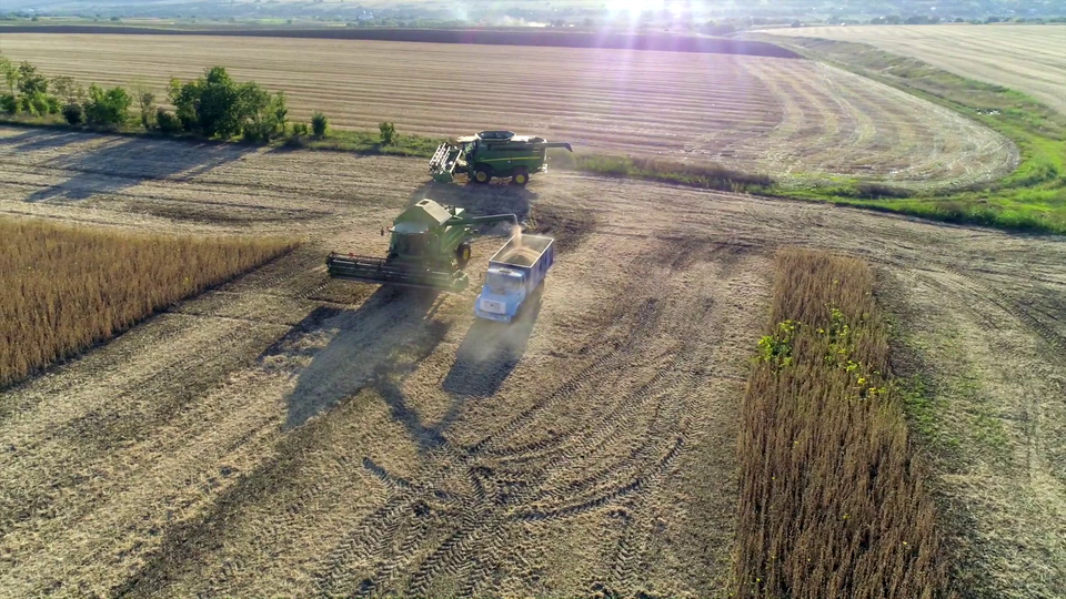 Ilustracja przedstawia piaszczysty teren oraz dwa pojazdy: jeden załadunkowy z otwartą skrzynią załadunkową, a drugi to koparka ładująca do skrzyni piach. W tle widoczne są silosy, czyli ogromne walcowate pojemniki ze stożkową powierzchnią górną. Służą one na przykład do składowania dużych ilości zboża.