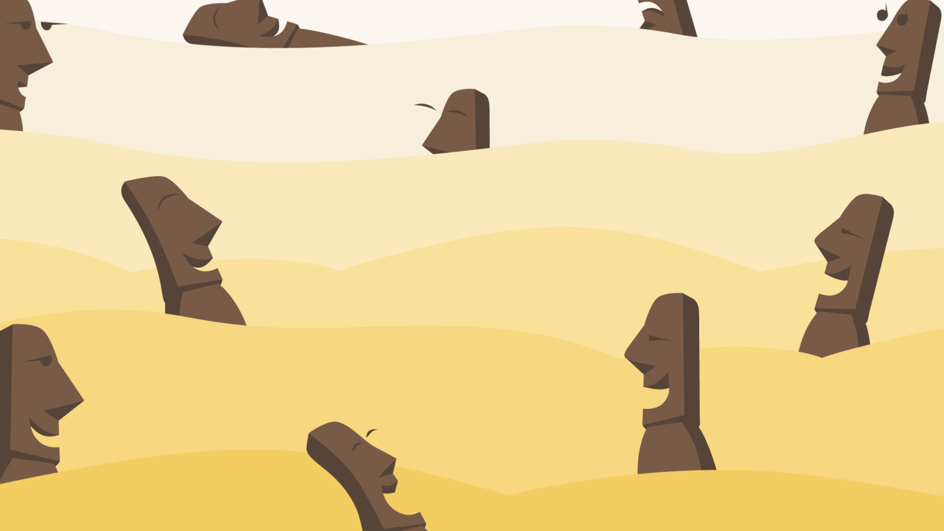 Ruchoma grafika przedstawia siedem identycznych, uśmiechniętych przypominających popiersie człowieka figurek częściowo zakopanych w piasku (na pustyni lub na wydmach). Tekst na obrazku: Wszystkiego najlepszego, lesie!