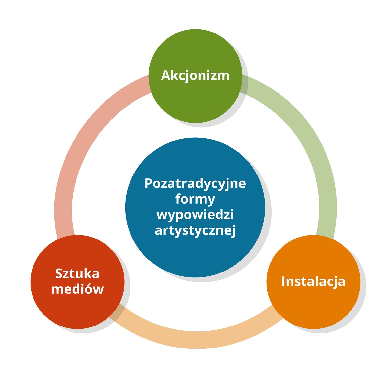 Ilustracja w formie prostokąta przedstawia schemat w kształcie okręgu z trzema punktami. Wewnątrz schematu znajduje się niebieski okrąg z białym tekstem: Pozatradycyjne formy wypowiedzi artystycznej. Wokół tego okręgu rozmieszczone są okręgi o kolorze zielonym, pomarańczowym i czerwonym. Zgodnie z ruchem wskazówek zegara podane zostały na nich białe podpisy: Akcjonizm, Instalacja, Sztuka mediów.