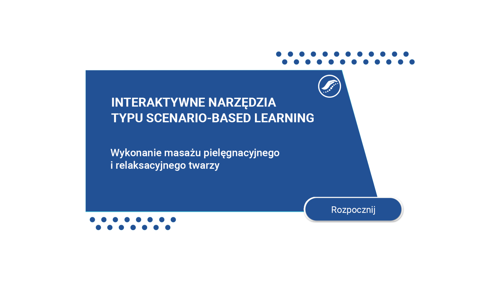 Interaktywne narzędzie typu scenario‑based learning “Wykonanie masażu pielęgnacyjnego i relaksacyjnego twarzyj” rozpoczyna się ekranem startowym z przyciskiem Rozpocznij.