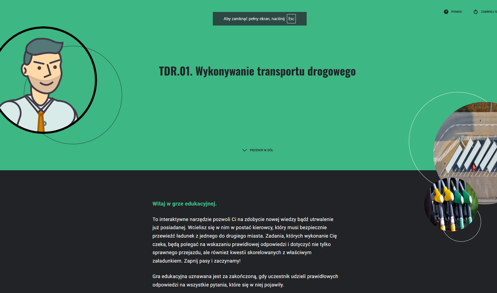 Ekran gry edukacyjnej po kliknięciu przycisku "Włącz tryb pełnoekranowy"