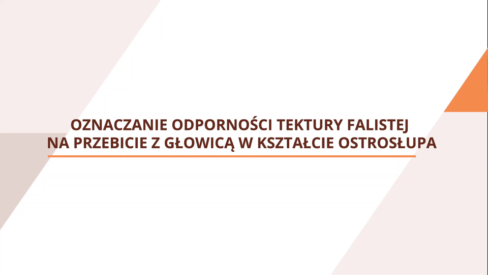Sekwencja filmowa pod tytułem "Oznaczanie odporności tektury falistej na przebicie z głowicą w kształcie ostrosłupa". W materiale filmowym opisano zagadnienia związane z odpornością na przebicie tektury falistej oraz przedstawiono urządzenie, które bada niniejszy parametr.