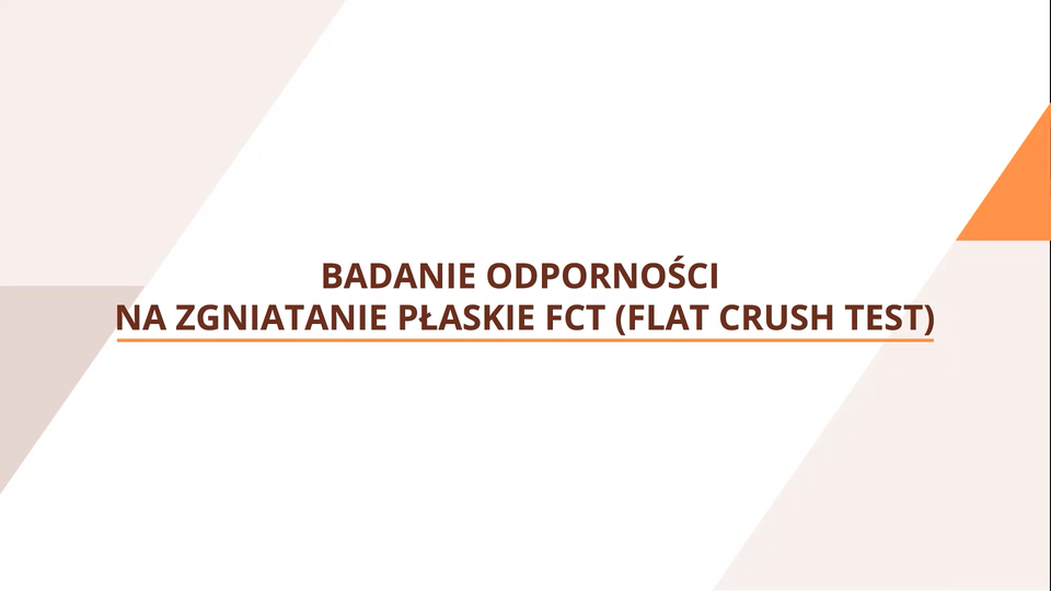 Sekwencja filmowa pod tytułem "Badanie odporności na zgniatanie płaskie FCT (Flat Crush Test)". W materiale wideo przybliżone zostały zagadnienia związane z badaniem odporności wytworów papierniczych na zagniatanie płaskie, jak i metody badania i jednostki, w którym ten parametr jest przedstawiany.