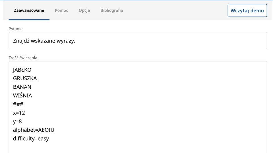 Parametr difficulty=# umożliwia wybranie prostszej wersji wykreślanki. Możliwe wartości: easy / middle / hard