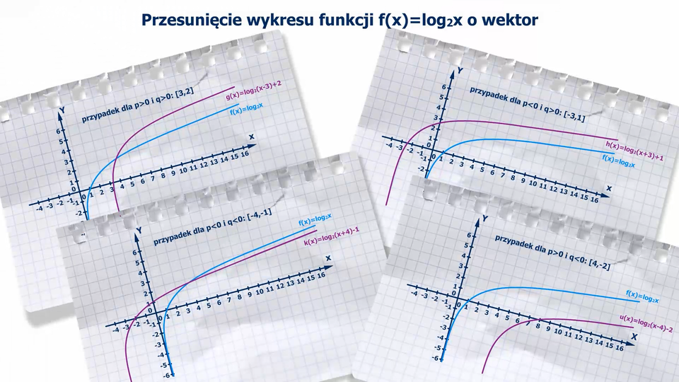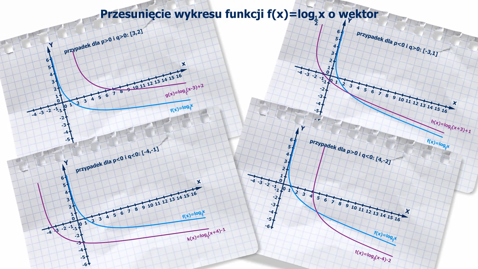 Animacja przedstawia przesunięcie wykresu funkcji wykładniczej f(x) = log przy podstawie jedna druga z x o wektor [p, q] w układzie współrzędnych. Rozpatrzono przypadki: Dla p>0 oraz q>0 przesunięcie o wektor [3,2] – otrzymano funkcję g(x) =[ log przy podstawie jedna druga z (x -3)] +2. Dla p0 przesunięcie o wektor [-3, 1] – otrzymano funkcję h(x) =[ log przy podstawie jedna druga z (x +3)] +1. Dla p<0 oraz q<0 przesunięcie o wektor [-4, -2] – otrzymano funkcję k(x) =[ log przy podstawie jedna druga z (x +4)] -2. Dla p>0 oraz <0 przesunięcie o wektor [4, -2] – otrzymano funkcję t(x) =[ log przy podstawie jedna druga z (x -4)] -2.