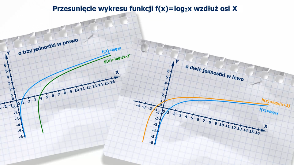 Animacja przedstawia przesunięcie wykresu funkcji logarytmicznej f(x) = log przy podstawie 2 z liczby x wzdłuż osi OX. Rozpatrzono dwa przypadki przesunięcia: o 3 jednostki w prawo - otrzymano funkcję g(x) = log przy podstawie 2 z liczby (x -3) oraz o 2 jednostki w lewo - otrzymano funkcję h(x) = log przy podstawie 2 z liczby ( x +2).