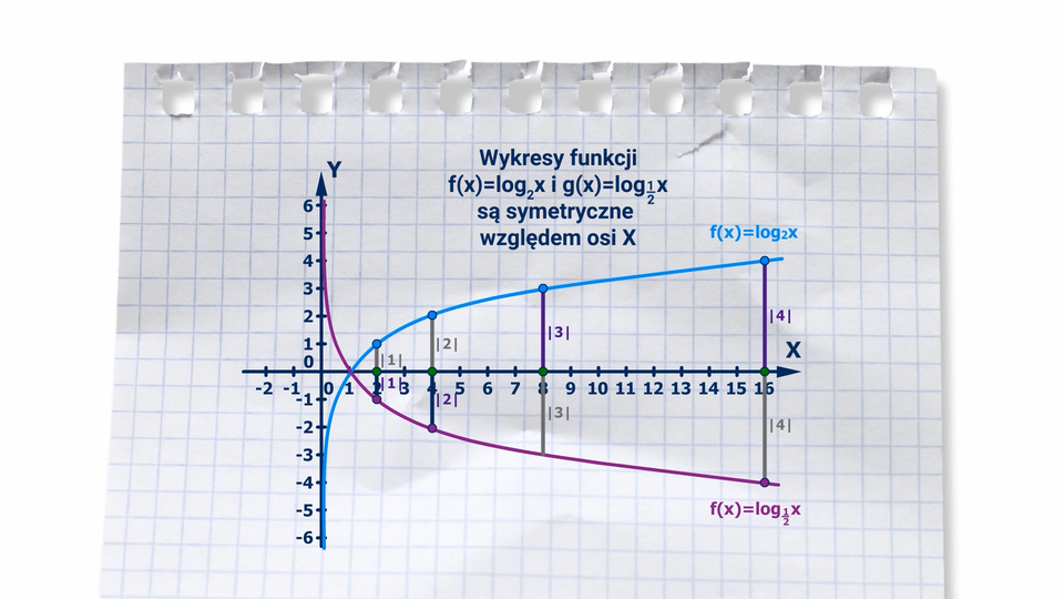 Animacja przedstawia wykresy funkcji logarytmicznej f(x) = log przy podstawie 2 z liczby x oraz g(x) = log przy podstawie jedna druga z liczby x. Pokazuje, że funkcja g(x) jest symetryczna do funkcji f(x) względem osi OX.