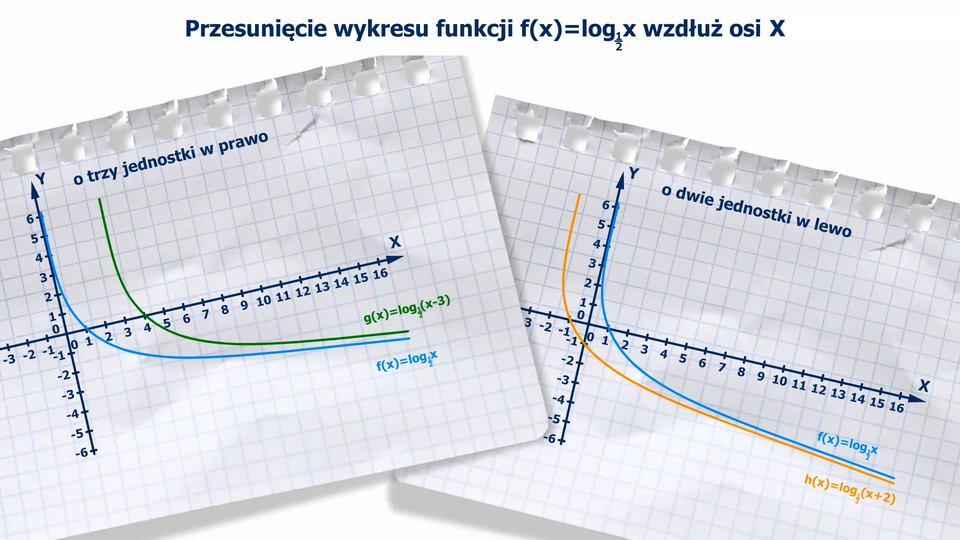 Animacja przedstawia przesunięcie wykresu funkcji logarytmicznej f(x) = log przy podstawie jedna druga z x wzdłuż osi OX układu współrzędnych. W wyniku przesunięcia o trzy jednostki w prawo otrzymujemy funkcję g(x) = log przy podstawie jedna druga z (x -3). W wyniku przesunięcia o dwie jednostki w lewo otrzymujemy funkcję h(x) = log przy podstawie jedna druga z (x +2).