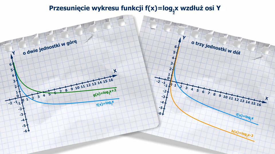 Animacja przedstawia przesunięcie wykresu funkcji logarytmicznej f(x) = log przy podstawie 2 z liczby x wzdłuż osi OY. Rozpatrzono dwa przypadki przesunięcia: o 2 jednostki w górę - otrzymano funkcję g(x) =(log przy podstawie 2 z liczby x) +2 oraz o 3 jednostki w dół -otrzymano funkcję h(x) = (log przy podstawie 2 z liczby x) -3.