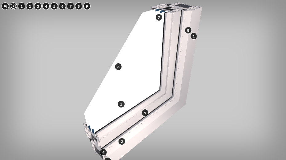 Siódma część galerii zatytułowanej „Wymagania, materiały, konstrukcje stolarki” zawiera wizualizację trzy de ukazującą elementy przekroju okna plastikowego. Przedstawiony przekrój można obserwować z każdej strony, a poszczególne elementy okna zostały podpisane za pomocą znaczników interaktywnych. Po kliknięciu znacznika po prawej stronie ekranu wyświetla się tekst: