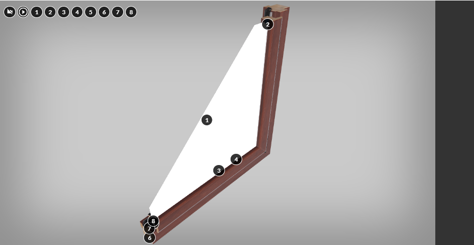 Szósta część galerii zatytułowanej „Wymagania, materiały, konstrukcje stolarki” zawiera wizualizację trzy de ukazującą elementy przekroju okna drewnianego. Przedstawiony przekrój można obserwować z każdej strony, a poszczególne elementy okna zostały podpisane za pomocą znaczników interaktywnych. Po kliknięciu znacznika po prawej stronie ekranu wyświetla się tekst: