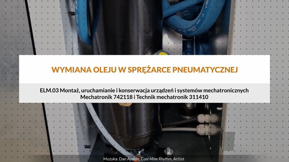 Film pt. Wymiana Oleju w sprężarce pneumatycznej dla klasyfikacji ELM 03. Montaż i konserwacja urządzeń i systemów mechatronicznych, zawód: Mechatronik 742118 i Technik mechatronik 311410.