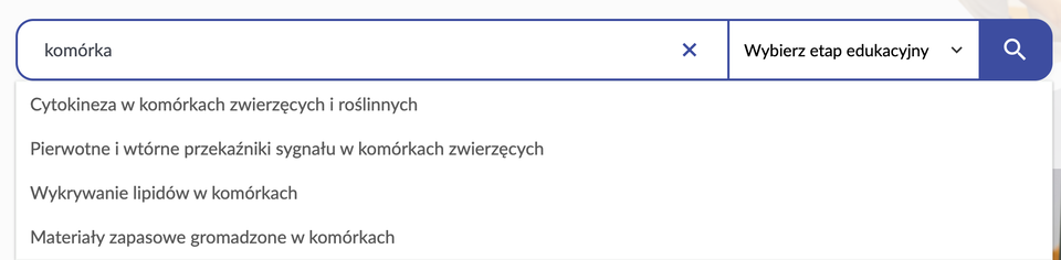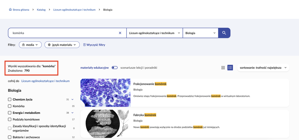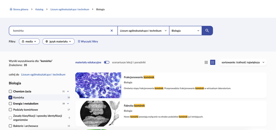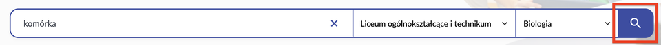 W tym przykładzie wykorzystamy inne rozwiązanie: w pierwszym kroku ograniczymy wyniki do materiałów dla liceum i z biologi (w polu wyszukiwarki wybieramy etap edukacyjny - „liceum i technikum” oraz przedmiot - „biologia”). Robimy to po to, aby odrzucić wyniki powiązane ze znaczeniem słowa „komórka” w innych kontekstach np. w informatyce.