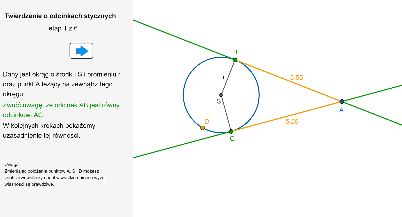 Rozważmy okrąg o środku w punkcie i promieniu oraz punkt leżący na zewnątrz tego okręgu. Poprowadźmy dwie styczne do tego okręgu przechodzące przez punkt . Punkty styczności oznaczmy i .