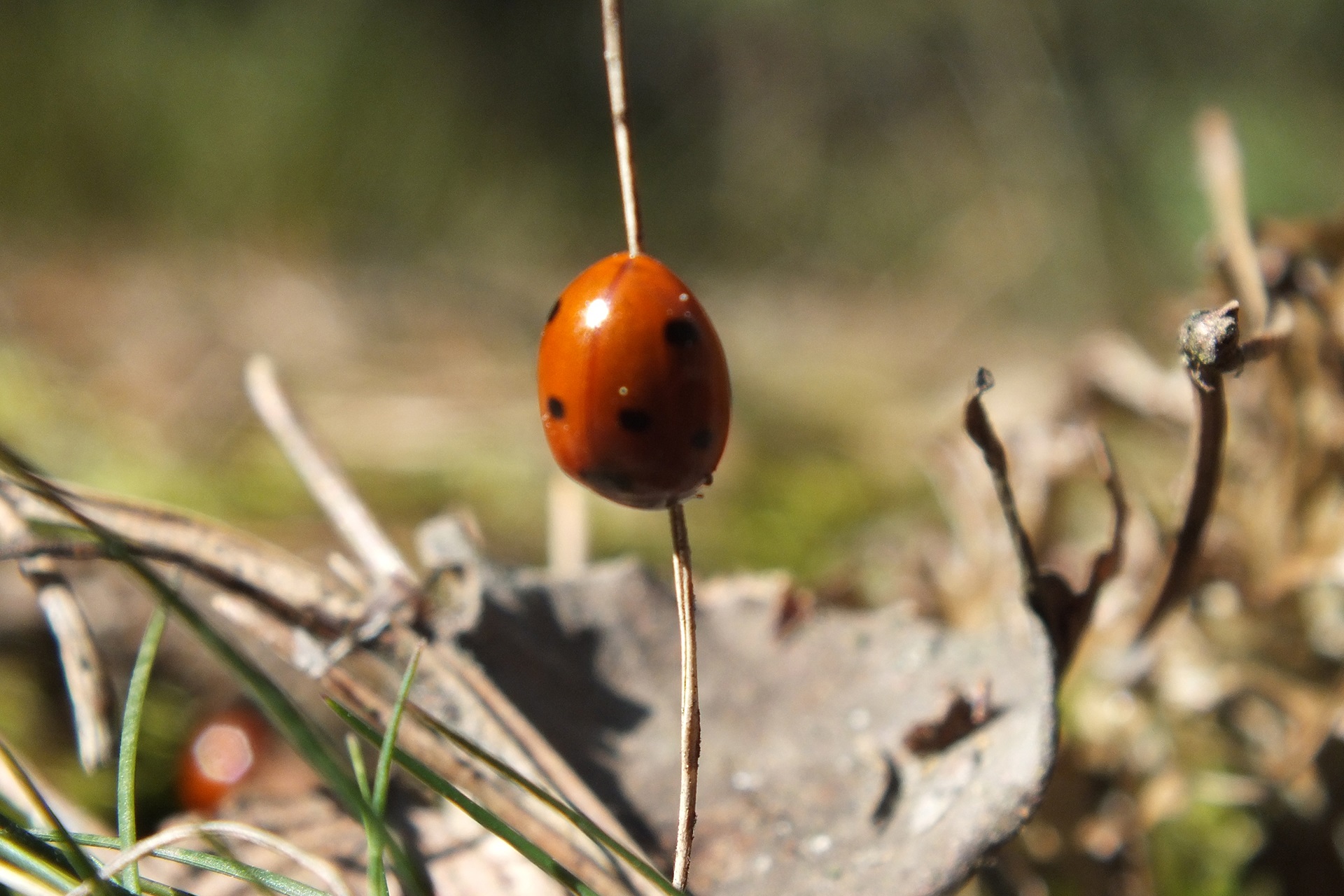 Plik do pobrania zawierający fotografię przedstawiającą biedronkę na źdźble trawy. Opis alternatywny pliku graficznego: Na fotografii ukazana jest biedronka, która siedzi na źdźble trawy. Biedronka ma intensywny czerwony kolor, a na jej pancerzyku znajduje osiem czarnych kropek. W tle ukazana jest niska roślinność, prawdopodobnie jest to ściółka.