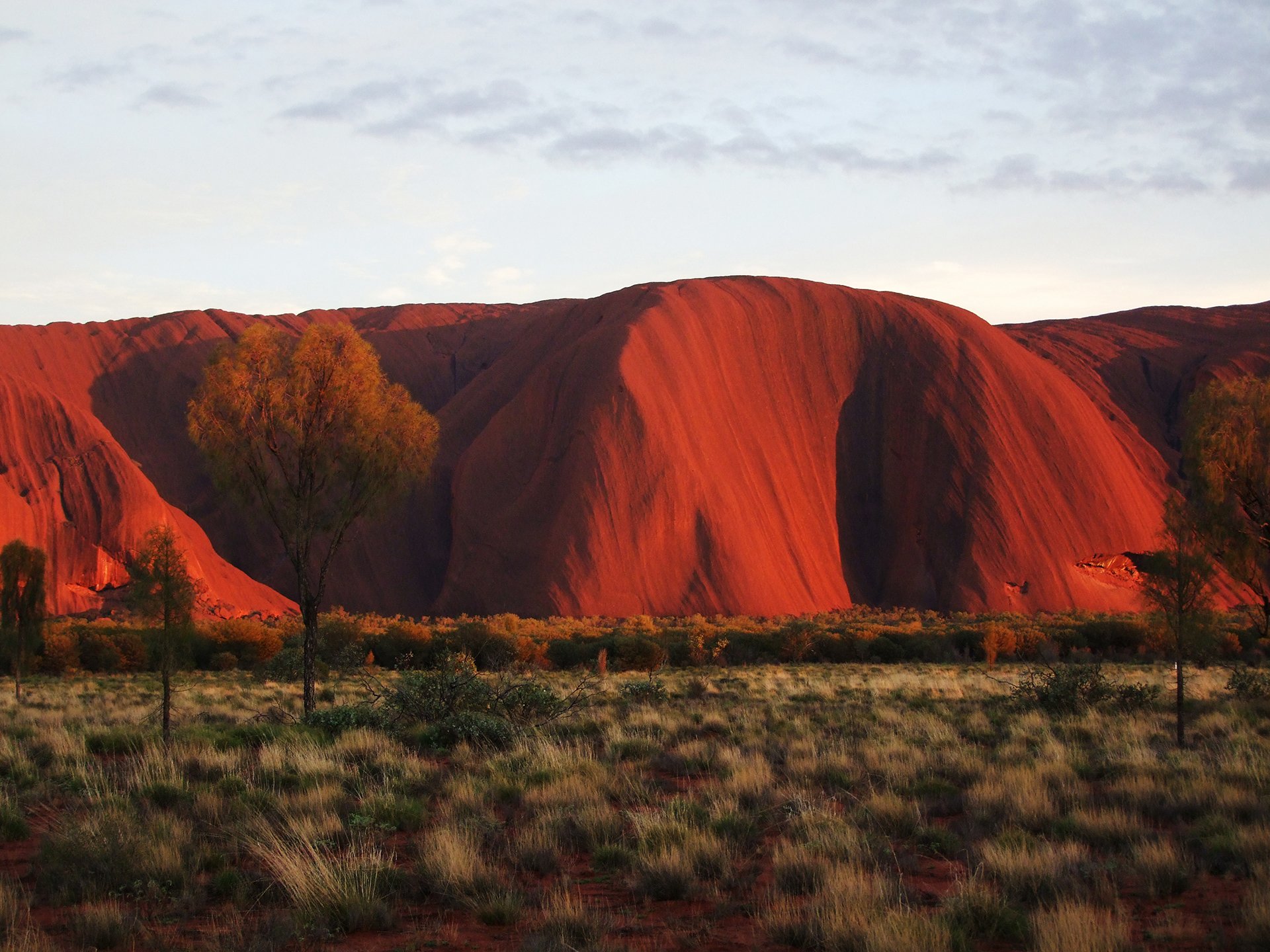 Plik do pobrania zawierający fotografię przedstawiającą część największego kamienia na świecie. Opis alternatywny pliku graficznego: Na fotografii ukazany jest fragment największego kamienia na świecie. Jest to jego prawa część. Ma jaskrawe ubarwienie w kolorze czerwonym. Kamień znajduje się na pustyni, dlatego główną roślinność na zdjęciu stanowią liczne suchorośla. Można także dostrzec kilka niewielkich drzewek.