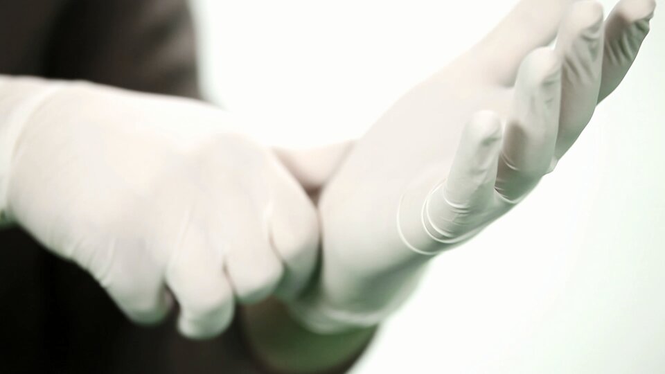 Film instruktażowy. Plansza z napisami: „Edukacja dla bezpieczeństwa. Aseptyczne zdejmowanie rękawiczek”. Nagranie rozpoczyna się zbliżeniem kamery na korpus człowieka w brązowym ubraniu nakładającego jednorazowe rękawiczki. Następuje zbliżenie jednej dłoni w rękawiczce, a następnie obu dłoni wyciągniętych przez aktora przed siebie. Zmiana ujęcia na przedstawiające całą postać aktora od pasa w górę. Zbliżenie rąk, palce prawej dłoni łapią lewą rękawiczkę na wysokości nadgarstka tak, by nie dotykać skóry lewego przedramienia i ściągają ją z ręki, wywracając rękawiczkę wewnętrzną stroną na wierzch. Zdjęta rękawiczka trzymana jest przez prawą dłoń. Palce lewej, gołej dłoni ruchem ślizgowym wsuwają się między rękawicę a nadgarstek prawej dłoni. Następnie demonstrator zdejmuje rękawiczkę, zwijając ją wzdłuż dłoni i naciągając na rękawiczkę trzymaną w palcach. Zmiana ujęcia na szerszy plan. Demonstrator zawiązuje na supeł jedną rękawiczkę, w której jest druga rękawiczka. Napis: „Pamiętaj, po zdjęciu rękawiczek natychmiast umyj ręce ciepłą wodą z mydłem”.