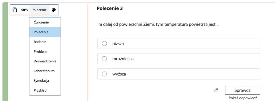 Komponent podobny do Bloku lekcyjnego z tym, że jest on automatycznie numerowany. Pozwala autorowi kursu dodawać różnego rodzaju zadania: od prostych poleceń po bardziej złożone doświadczenia czy symulacje, także składające się z wielu komponentów.