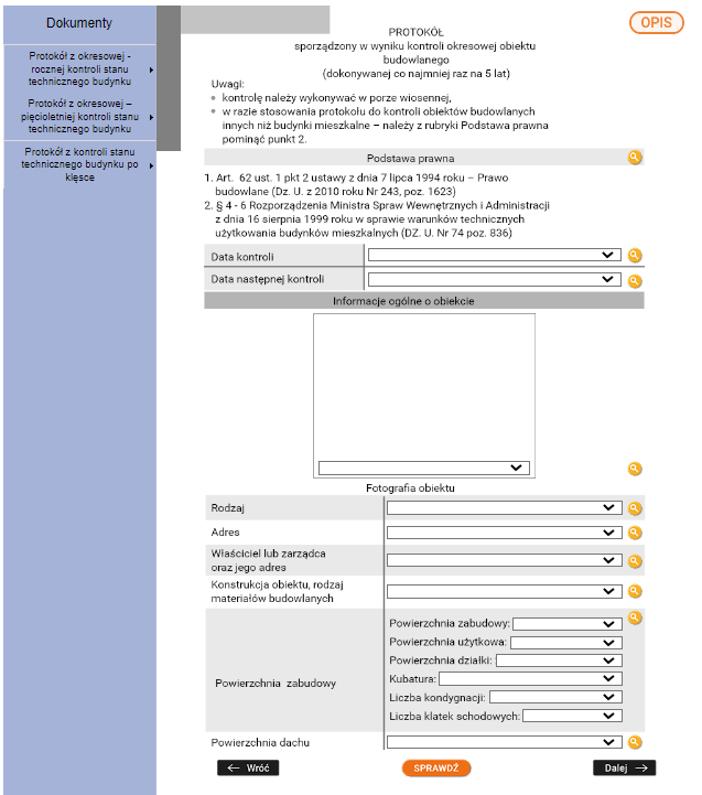 Dokumentacja interaktywna składa się z wzoru protokołu kontroli, przykładowo wypełnionego protokołu oraz protokołu do uzupełnienia.