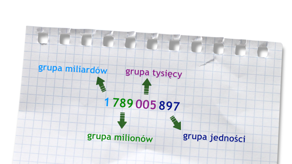 Aby przeczytać liczbę większą niż czterocyfrowa, dobrze jest ją zapisać, grupując jej cyfry po trzy, zaczynając od prawej strony, i pomiędzy każdą grupą zostawić nieduży odstęp.