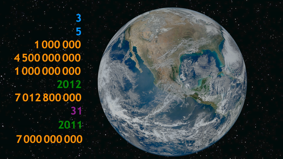 Animacja przedstawia podstawowe informacje dotyczące naszej planety w postaci liczb wielocyfrowych.